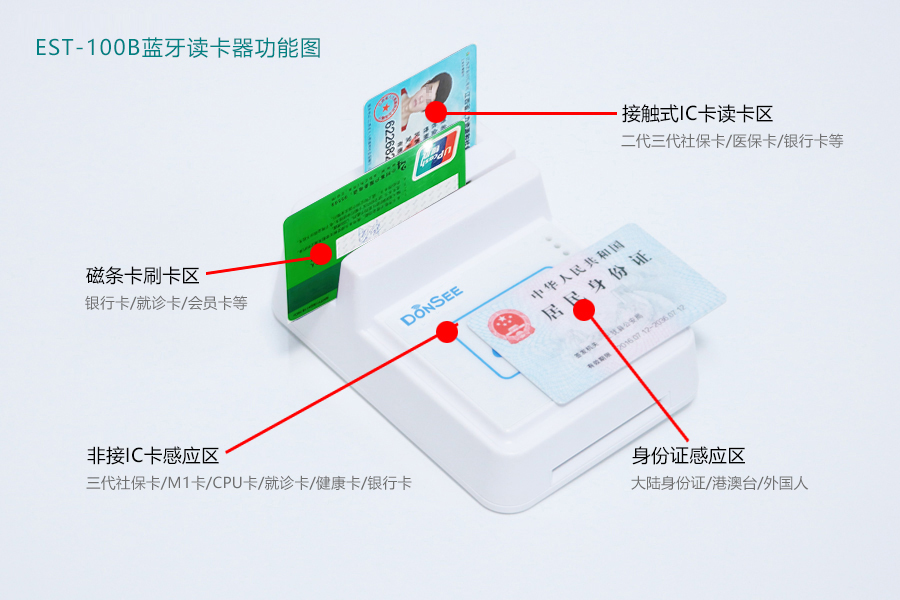 EST-100是廣東東信智能科技有限公司專為人社、醫(yī)療、銀行、藥店、景區(qū)、圖書館、交通、政務等行業(yè)而定制的藍牙社??ㄗx卡器,該產(chǎn)品適合全國的身份證和社保卡,可提供開發(fā)接口與各行業(yè)系統(tǒng)對接使用。