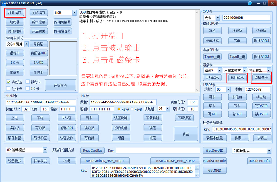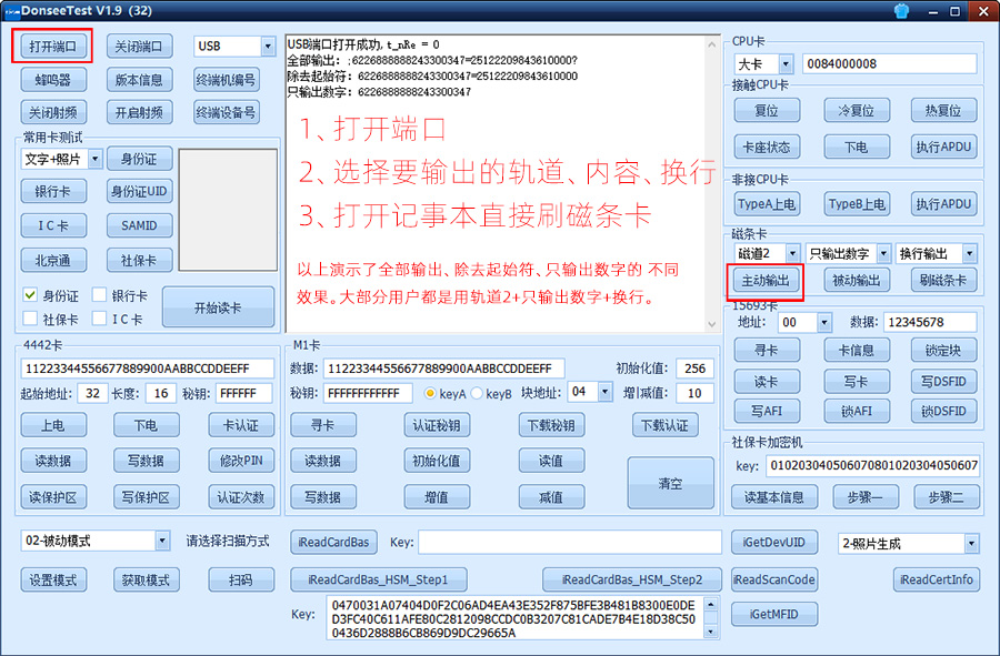 2、被動輸出,就是刷卡是沒有反應的,得通過調用讀卡器函數 Donsee_ReadMagCard 后,磁條模塊才工作,此時刷卡才有數據,刷卡數據是在函數中獲取。