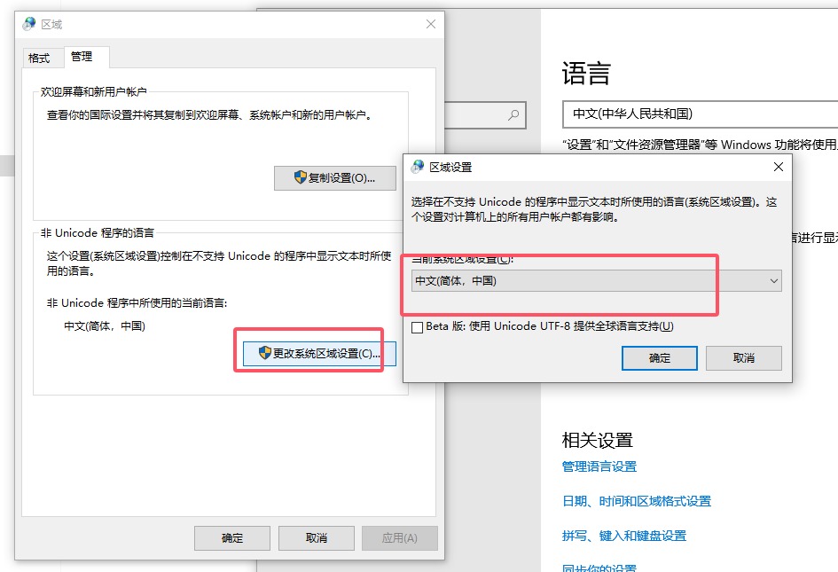 4、打開 更改系統(tǒng)區(qū)域設(shè)置>>選擇中文(簡(jiǎn)體,中國(guó))