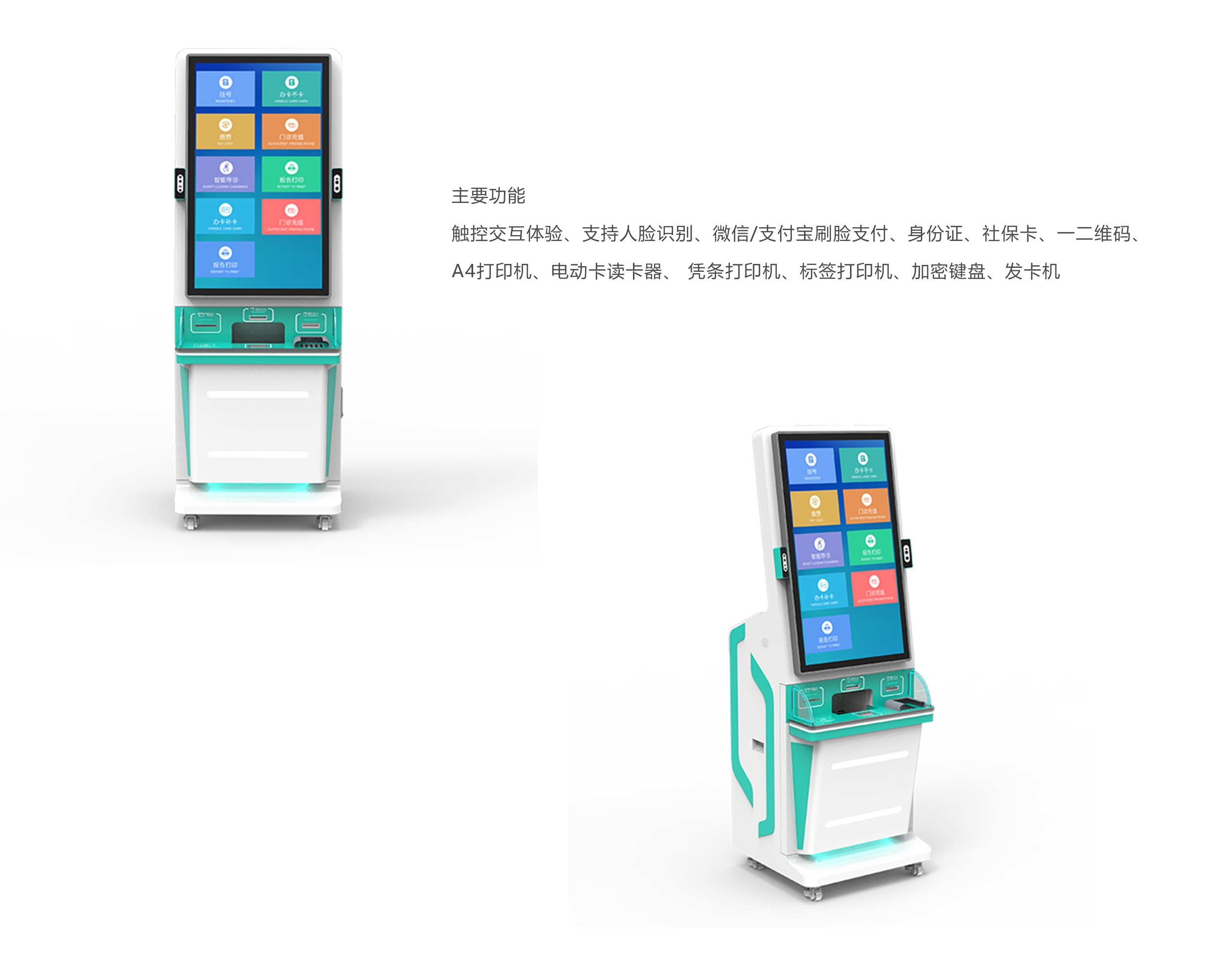 醫(yī)療自助服務(wù)終端可集成身份證讀卡器、社??ㄗx卡器、電子社??⊕叽a、RFID圖書讀卡器等,患者自助掛號、查詢、打印、繳費(fèi)等諸多功能。